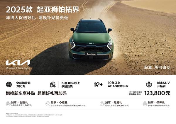 作为“全球都市SUV开拓者”,狮铂拓界30余载历经五代传承,凭借卓越的品质赢得超780万全球用户的青睐。今年,悦达起亚推出2025款狮铂拓界,新车在继承“Sportage”经典品质与全能实力之外,更结合中国用户的实际出行需求,1.5T和2.0T车型各新增豪华舒享版、尊贵智享版2个车型版本,升级了用户高频使用的全景天窗、驾驶席电动座椅(6向)、外后视镜电动折叠/加热、SVM360°全景影像和BVM侧后方影像等舒适和智能配置,让出行舒适性与安全性得到进一步提升。