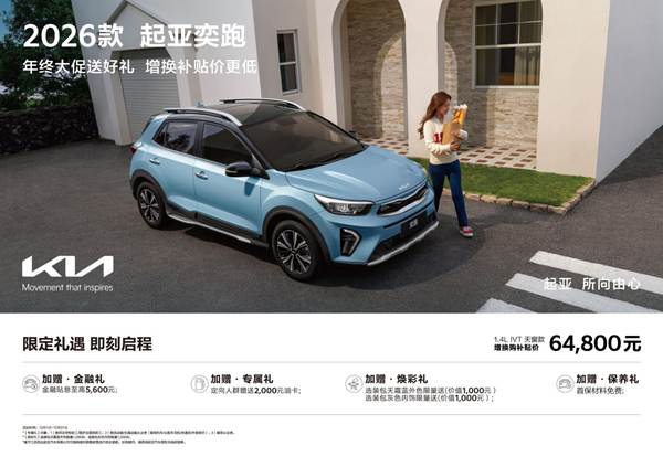日前,悦达起亚12月购车钜惠活动正在火热进行中。即日起至12月31日,消费者购买2026款起亚奕跑、2025款起亚狮铂拓界、2026款起亚赛图斯、2026款起亚嘉华、起亚新K3、2025款起亚K5、智跑、索奈等车型,可享“年末大促价+增换购补贴价”组合权益以及多重购车福利;购买EV5可享“以旧换新”省补兜底政策及多重购车福利,各省市“以旧换新”补贴政策暂停之日起,悦达起亚将依据当地原补贴标准,对购买EV5的用户实行至高15,000元的补贴兜底;此外,购买EV6的用户,还可享12项购车权益,将福利拉满。
