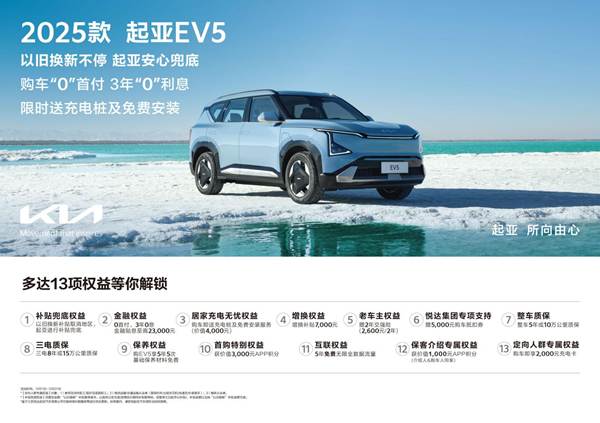 EV5是起亚首款在中国首发、中国生产并销往全球的战略车型。2025款EV5起售价14.98万元,新车不仅增配不加价,还可享至高13项超值购车权益,包括以旧换新补贴取消地区,补贴兜底权益、0首付,3年0息(金融贴息至高23,000元)、赠送充电桩及免费安装服务(价值4,000元)、7,000元增换购补贴、起亚老车主购车赠2年交强险(2,600元/2年)、悦达集团5,000元购车抵扣券、整车5年或10万公里质保、三电8年或15万公里质保、5年5次基础保养材料免费、价值3,000元APP积分首购特别权益、5年免费无限全数据流量、保客介绍专属权益可获1,000元APP积分(介绍人&购车人同享)、定向人群购车即享2,000元充电卡等优惠。