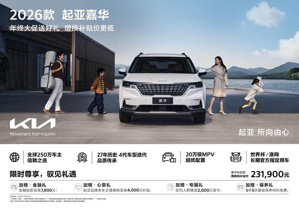 即日起至12月31日,消费者购买2026款起亚嘉华可享“年末大促价+增换购补贴价”组合权益,豪华科技款综合优惠后,增换购补贴价仅需231,900元。同时,购车还可享金融贴息至高7,800元、起亚品牌老车主增换购至高4,000元补贴、定向人群赠送2,000元油卡、5年5次基础保养材料免费等多项超值权益。