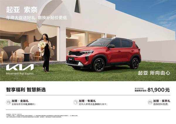值得一提的是,教师、医护人员、物流运输和交通运输从业人员(网约车/出租车司机、快递员、外卖骑手)及媒体从业者等,购车还另享2,000元电卡或油卡;此外,12月31日前,消费者前往悦达起亚线下授权店参加指定车型试驾,还有机会赢取最高价值5,000元购车抵用券,以及京东E卡、QQ音乐绿钻月卡等福利,将购车福利拉满。