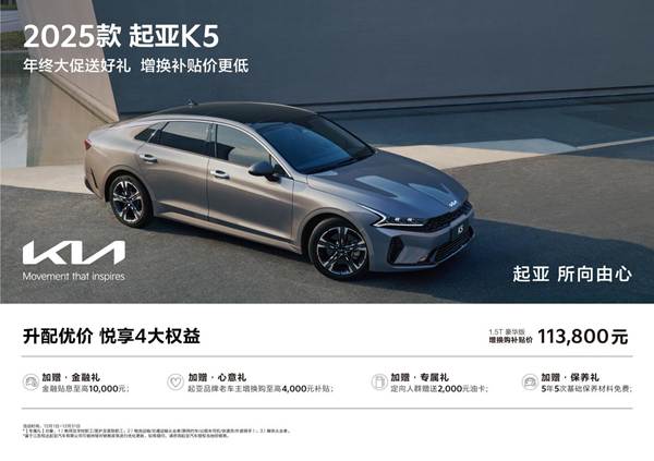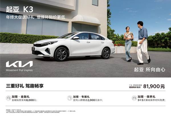 与此同时,消费者购买起亚新K3同样可享“年末大促价+增换购补贴价”组合权益,以及金融贴息、2,000元油卡、5年5次基础保养材料免费等权益。而2025款起亚K5、智跑则在上述购车权益基础上,分别增加4,000元和2,000元的起亚品牌老车主增换购补贴权益。