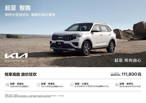 12月31日前购买新车的用户,可享“年末大促价+增换购补贴价”组合权益,以官方指导价189,800元1.5T尊贵智享版为例,增换购补贴价仅需123,800元。此外,消费者购车还可享金融贴息至高11,000元、起亚品牌老车主增换购至高3,000元补贴、定向人群赠送2,000元油卡,以及5年5次基础保养材料免费等权益。