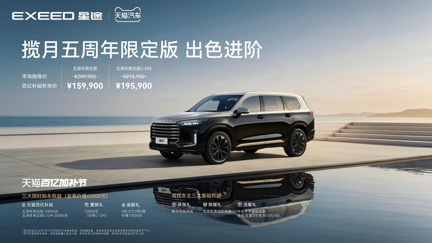 即日起,用户登录天猫平台,搜索“EXEED星途汽车旗舰店”,即可一键锁定两款限定版车型。揽月五周年限定版市场指导价分别为209900元及215900元,联合天猫百亿补贴,最高叠加6万元购车权益,首任车主三大购车权益将继续保留。用户通过天猫星途官方旗舰店购买5000元订金商品,锁定平台独家权益补贴,后续凭借订单电子凭证到线下门店核销即可享受优惠,支付尾款完成购车。