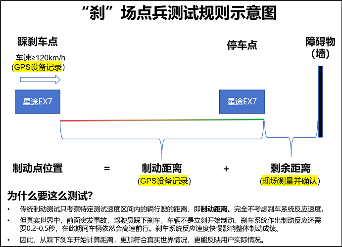 传统制动测试只考查特定测试速度区间内车辆行驶的距离,忽视了刹车系统作出制动反应还需要0.2-0.5s的客观事实,这样测出来的刹车距离,无法反映在真实路面上高速行驶时一台车实际上的制动效果。