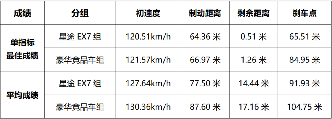 从单指标的最佳成绩看,星途EX7制动初始速度为120.51km/h、制动距离64.36m,剩余距离0.51m、刹车点65.51m。而豪华竞品组的单最好成绩,是在制动初速度121.57km/h的时速下,制动距离66.97m、剩余距离1.26m、刹车点84.95m,制动初始速度仅有微弱差距的基础上,比EX7最好成绩远了近20m。