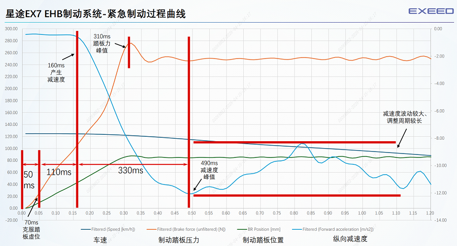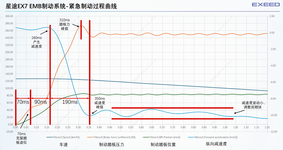 消费者对于新生的技术总是充满担心,例如EMB系统电子设备是否会受到高温影响导致失效呢,“烈火真金”项目用成绩直观证明了EMB在连续制动高温中的可靠性,更展示了EMB不依赖液压传递、电信号直达的优势,彻底规避了传统液压制动容易在高温中产生“汽阻”现象导致制动踏板变软、制动力下降的风险。此外,星途EX7所配备的FNC碳氮共渗制动盘也具备耐高温的特性,在这场高强度连续制动测试中,同样功不可没。