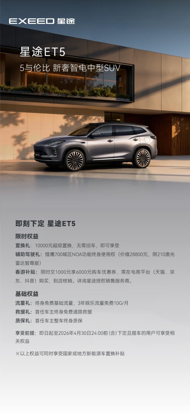 当不少品牌还在筹划小长假期间的促销方案时,星途直接甩出了一套覆盖全系车型的“五一特别版”购车权益。其中最引人关注的,无疑是刚刚上市不久的新奢智电中型SUV,星途ET5。